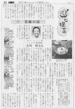 2度目の連載は、弊社の商品である「お豆腐(大豆から作られる様々な商品)」というテーマで、2011年11月6日から2012年1月15日にかけて全10回に渡り執筆させていただきました。※記事タイトルをクリックしていただくと、新聞記事のPDFがご覧いただけます。