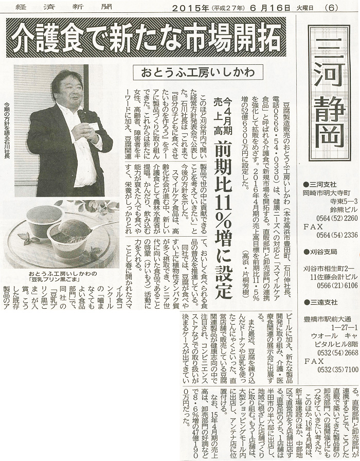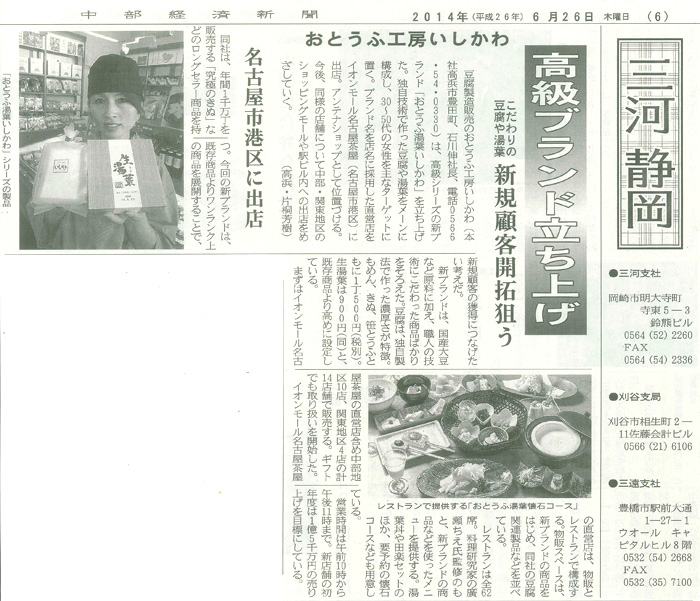 - 4月6日|「豆腐店をチェーン展開」【中部経済新聞】