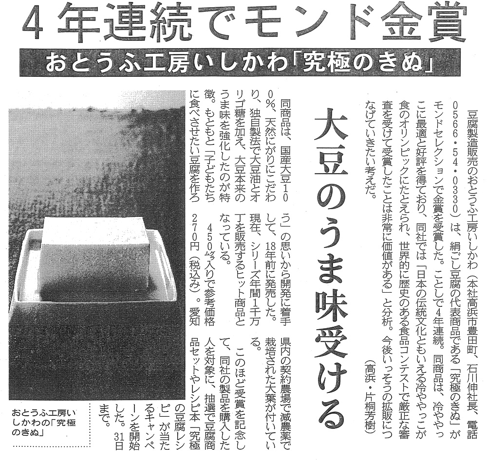 - 7月2日|4年連続でモンド金賞「究極のきぬ」【中部経済新聞】