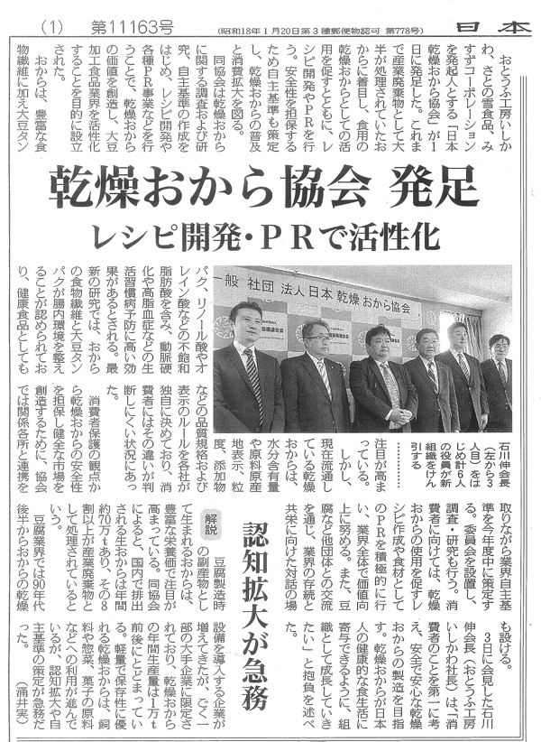 - 4月8日|乾燥おから協会発足 レシピ開発・PRで活性化【日本食糧新聞】