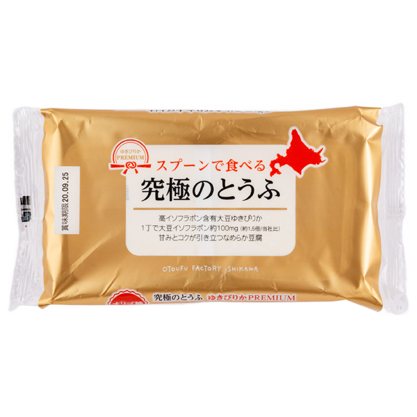 ゆきぴりかとは、高イソフラボン含有大豆で、1丁あたり大豆イソフラボンを約100mg(約1.5倍/当社比)含んでいます。ぴりかはアイヌ語で美人の意味です。やわらかく甘めな仕上がりなので、デザート感覚に黒蜜ときな粉をかけて、また蜂蜜と混ぜて豆腐クリームとしてもおすすめです。